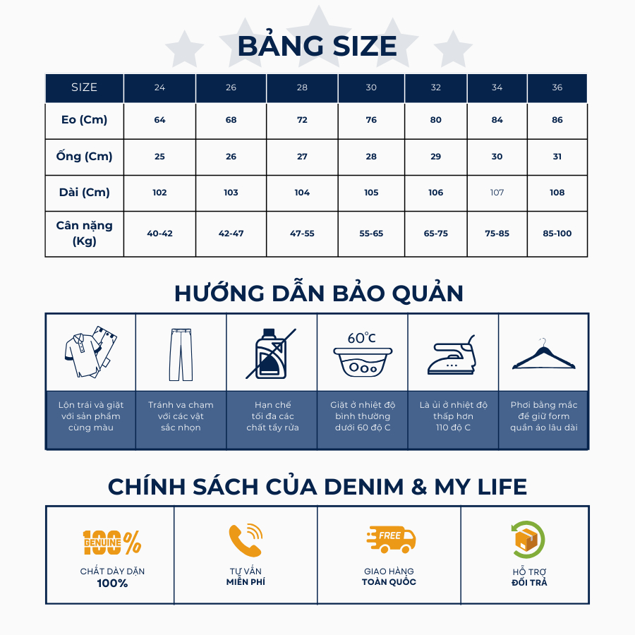 - Size 28: Cân nặng 47-55kg, chiều dài quần 104cm