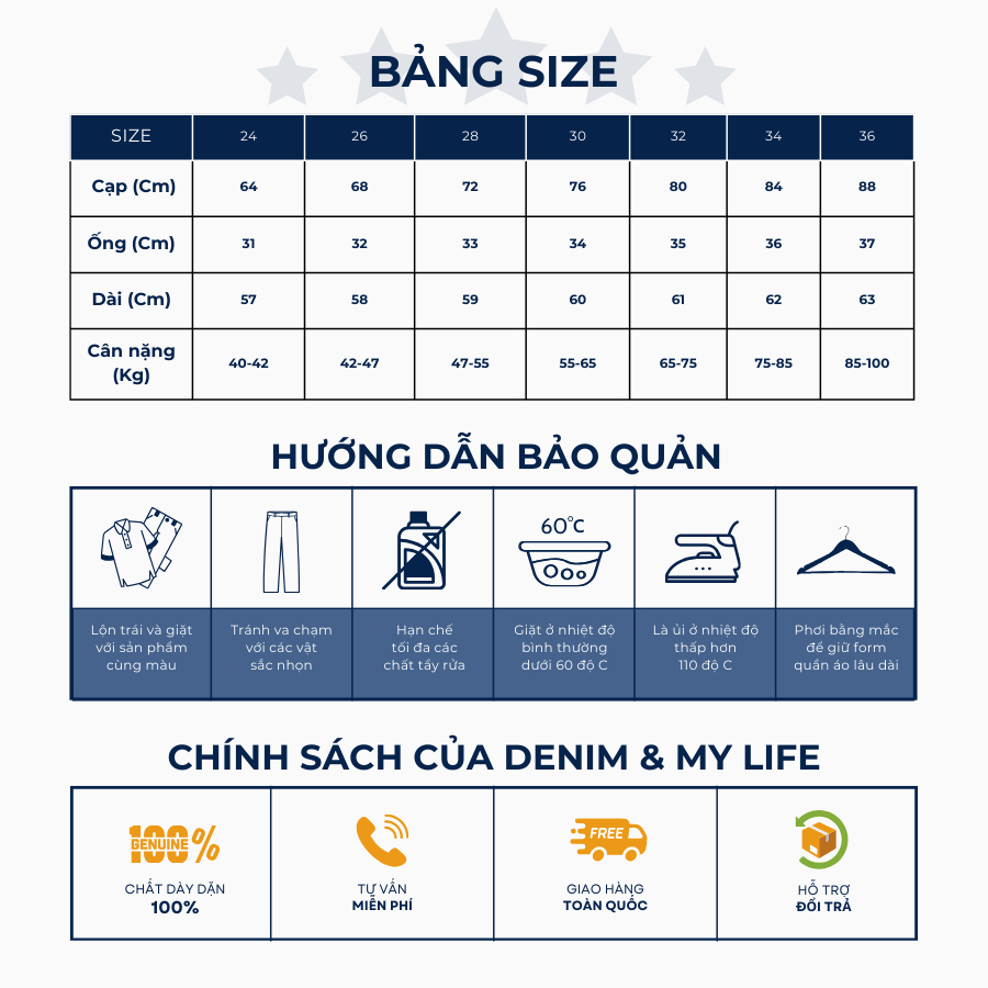 - Size 30: Cân nặng 55-65kg, chiều dài quần 60cm